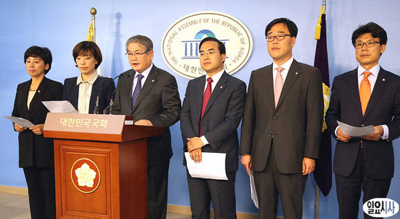 7일 오전, 국회 정론관에서 민주당 초선 의원들이 기자회견을 열고 손학규 상임고문의 재보선 경기 화성갑 출마를 촉구기자회견을 갖고 있다. (왼쪽부터 남인순, 배재정, 김용익, 박홍근, 김기식, 진성준 의원)