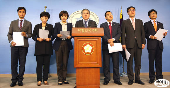 7일 오전, 국회 정론관에서 민주당 초선 의원들이 기자회견을 열어 손학규 상임고문의 재보선 경기 화성갑 출마를 촉구기자회견을 갖고 있다. (왼쪽부터 김광진, 남인순, 배재정, 김용익, 박홍근, 김기식, 진성준 의원)