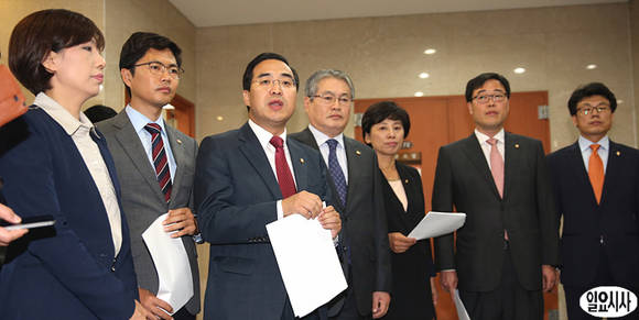 7일 오전, 국회 정론관에서 민주당 초선 의원들이 기자회견을 열어 손학규 상임고문의 재보선 경기 화성갑 출마를 촉구기자회견 후 취재진의 질문에 답변하고 있다. (왼쪽부터 배재정, 김광진, 박홍근, 김용익, 남윤인순, 김기식, 진성준 의원)