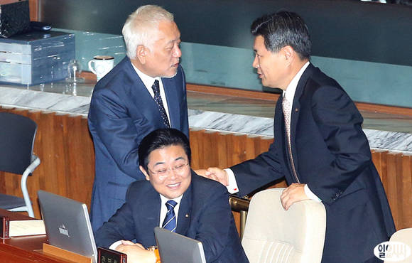 민주당 김한길 대표가 7일 오전 국회 본회의장에서 열린 본회의 직전, 새누리당 홍문종 사무총장과 악수하고 있다.