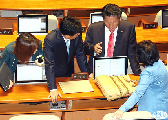 민주당 정청래 의원이 7일 오전 국회 본회의장에서 열린 본회의 직전, 김현 등 의원들과 이야기를 나누고 있다.