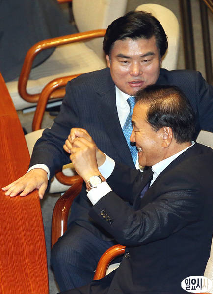 이재오 새누리당 의원이 7일 오전 국회 본회의장에서 열린 본회의 직전, 원유철 의원과 재미있는 광경을 연출하고 있다.