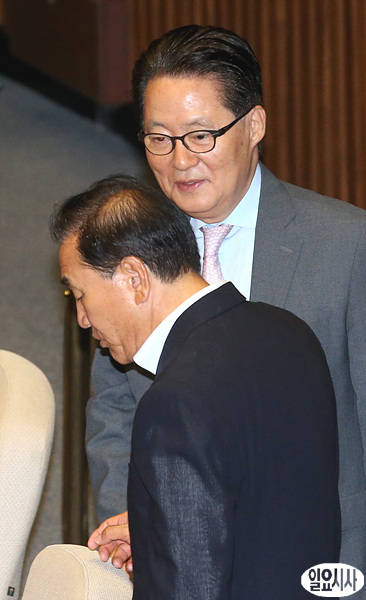 박지원 민주당 의원이 7일 오전 국회 본회의장에서 열린 본회의 직전, 새누리당 이재오 의원과 조우하고 있다.