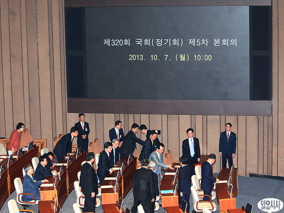 서남수 교육부, 김관진 국방부장관 등이 7일 오전 국회 본회의장에서 열린 본회의 직전, 서로 악수를 하고 있다.