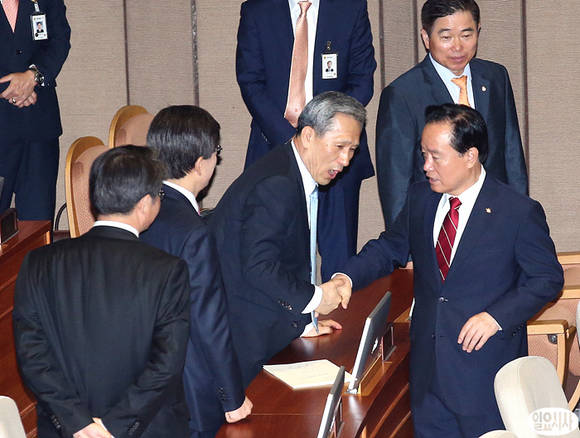 김관진 국방부장관이 7일 오전 국회 본회의장에서 열린 본회의 직전, 이병석 국회부의장과 악수하고 있다.