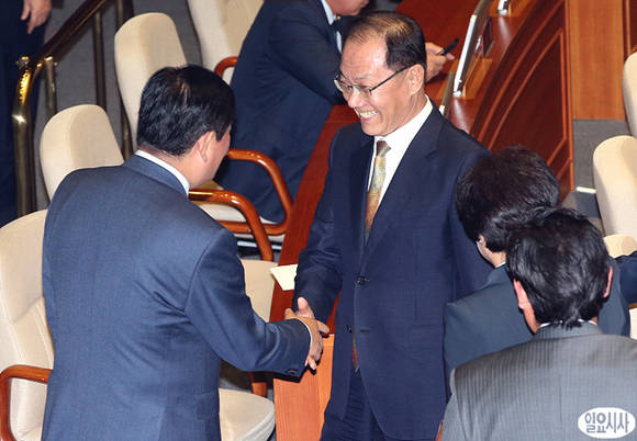 황우여 새누리당 대표와 최경환 원내대표가 7일 오전 국회 본회의장에서 본회의 직전, 악수를 나누고 있다