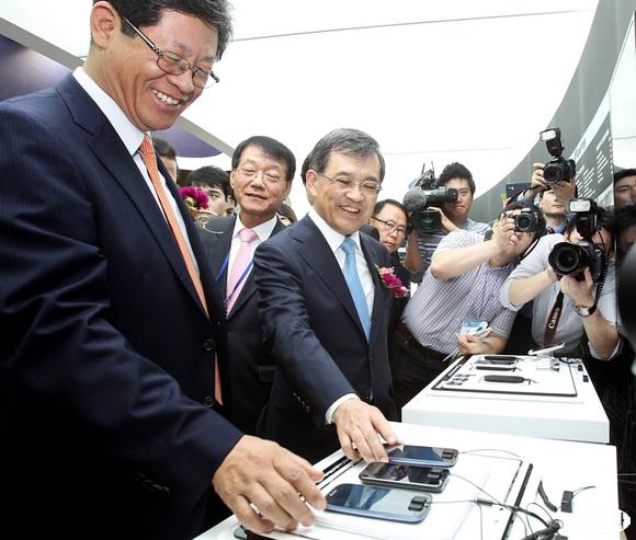 '2013 전자정보통신산업대전'이 7일 경기도 일산 킨텍스에서 열리고 있는 가운데 삼성전기 부스를 찾은 김재홍 산업통상자원부 제1차관(왼쪽)과 권오현 삼성전자 대표이사가 무선충전기를 살펴보고 있다.