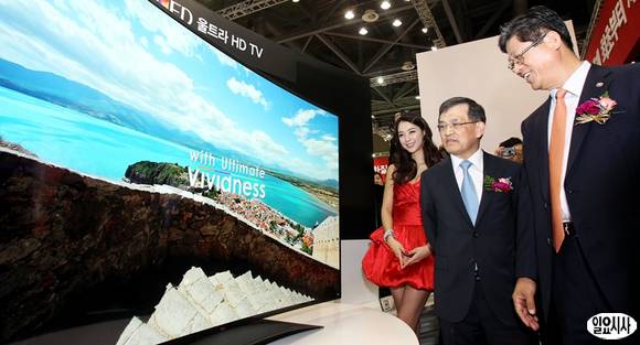 '2013 전자정보통신산업대전'이 7일 경기도 일산 킨텍스에서 열리고 있는 가운데 LG전자 부스를 찾은 김재홍 산업통상자원부 제1차관(오른쪽)과 권오현 삼성전자 대표이사가 곡면 OLED 울트라 HD TV를 살펴보고 있다.