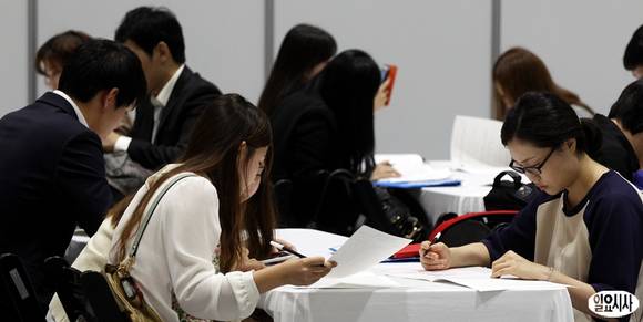 8일 서울 삼성동 코엑스에서 열린 '2013 IT·메디컬 채용박람회'를 찾은 구직자들이 적성검사지를 작성하고 있다.