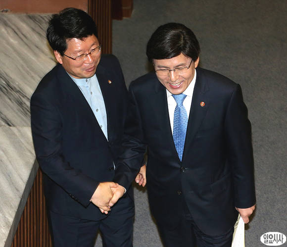 오병윤 통합진보당 원내대표(왼쪽)가 8일 오전, 국회 본회의장에서 황교안 법무부 장관과 악수를 나누고 있다.