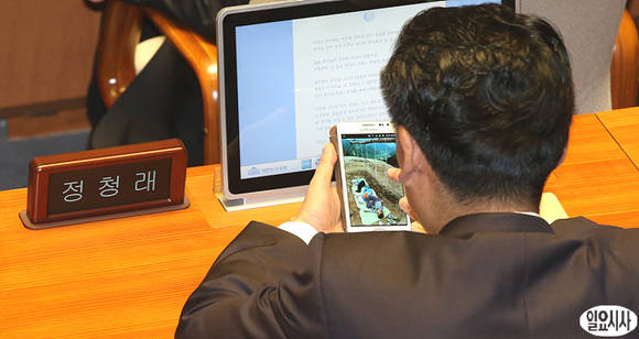 민주당 정청래 의원이 8일 오전 국회 본회의장에 참석 도중 스마트폰으로 밀양 송전탑 공사 관련 사진을 보고 있다.