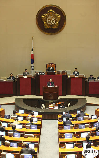 전병헌 민주당 원내대표가 8일 오전, 국회 본회의장에서 교섭단체 대표연설을 하고 있다.