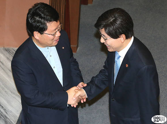 오병윤 통합진보당 원내대표(왼쪽)가 8일 오전 국회 본회의장에서 황교안 법무부 장관과 악수를 나누고 있다.