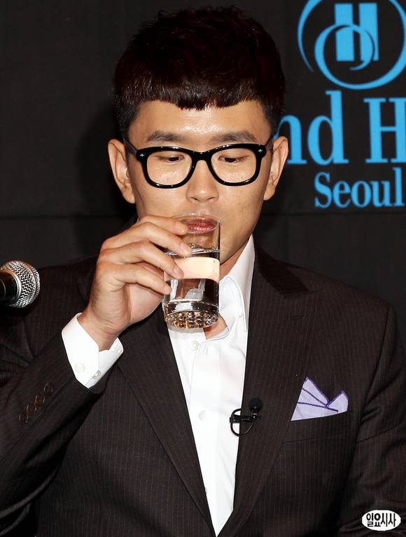 개그맨 윤형빈이 8일 오후 서울 홍은동 그랜드힐튼호텔에서 열린 로드FC 종합격투기 데뷔 기자회견에서 물을 마시고 있다.