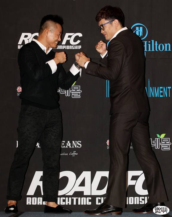 개그맨 윤형빈(오른쪽)이 8일 오후 서울 홍은동 그랜드힐튼호텔에서 열린 로드FC 종합격투기 데뷔 기자회견에서 서두원 선수와 포토타임을 갖고 있다.