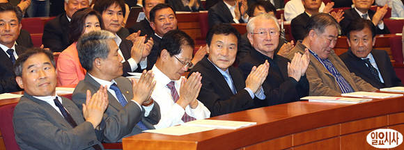 손학규 민주당 상임고문이 8일 오후, 국회헌정기념관에서 열린 동아시아미래연구 창립 심포지엄에서 박수치고 있다.