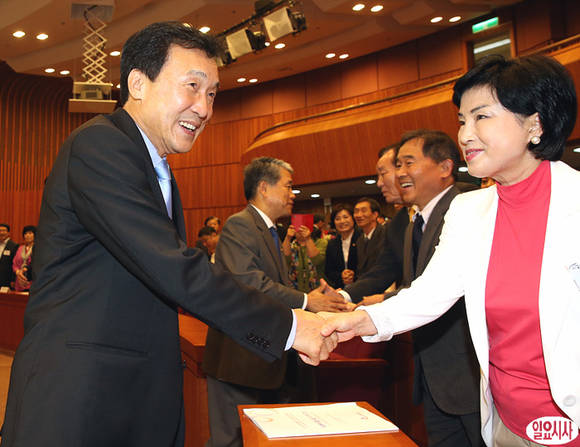 손학규 민주당 상임고문이 8일 오후, 국회헌정기념관에서 열린 동아시아미래연구 창립 심포지엄장에 입장하면서 전혜숙 전 의원과 악수하고 있다.