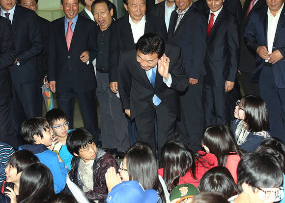 손학규 민주당 상임고문이 8일 오후, 국회헌정기념관에서 열린 동아시아미래연구 창립 심포지엄 입장 도중 국회를 찾은 아이들에게 귀 기울이고 있다.