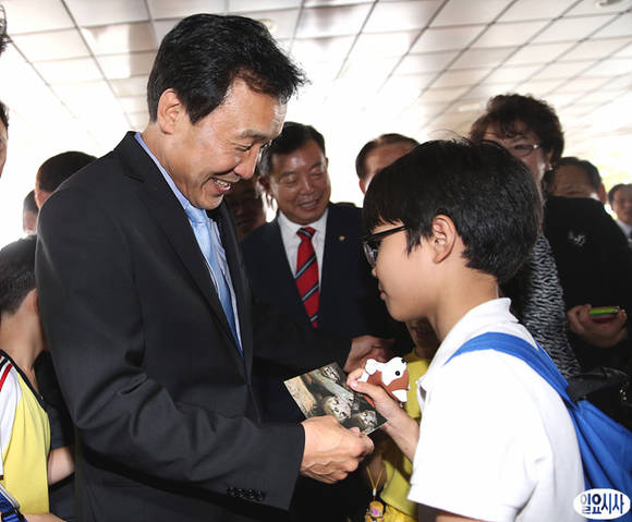 손학규 민주당 상임고문이 8일 오후, 국회헌정기념관에서 열린 동아시아미래연구 창립 심포지엄장 안으로 입장하던 도중 한 어린이로부터 선물을 건네받고 있다.