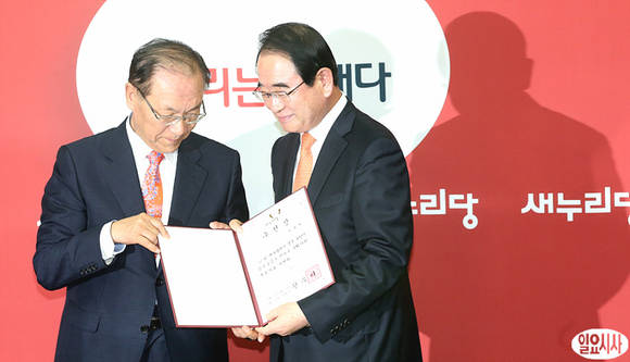황우여 새누리당 대표(왼쪽)가 8일 오후 서울 여의도동 새누리당사에서 포항남·울릉 박명재 후보에게 10·30 재·보선 공천장 수여 후 기념사진을 촬영하고 있다.