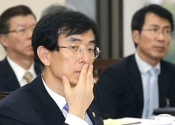 이용걸 방위사업청장이 8일 국회에서 열린 국방위원회 전체회의에서 의원들에 질의를 듣고 있다.