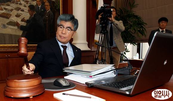 김중수 한국은행 총재가 10일 오전 서울 중구 한국은행에서 열린 기준금리 인상 여부 등을 결정하기 위한 금융통화위원회의에 참석, 의사봉을 두드리고 있다.