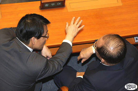 황우여 새누리당 대표(오른쪽)와 윤상현 의원이 10일 국회 본회의장에서 대화하고 있다.