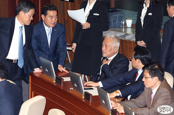 김한길 민주당 대표, 전병헌 원내대표 등 민주당 의원들이 10일 오후 국회 본회의장에서 본회의 직전, 대하를 나누고 있다.
