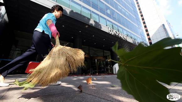 검찰이 효성그룹의 탈세 의혹과 관련해 압수수색을 실시한 11일 서울 마포구 공덕동 효성그룹 본사 앞에서 직원들이 낙엽을 쓸고 있다.