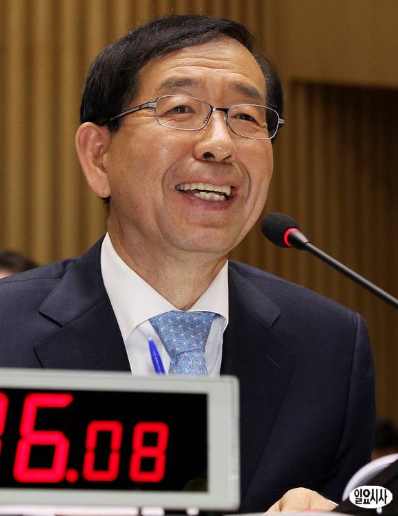 박원순 서울시장이 18일 서울시청에서 열린 국회 국토교통위원회의 서울시 국정감사에서 의원들의 질의를 경청하는 도중 밝게 웃고 있다.