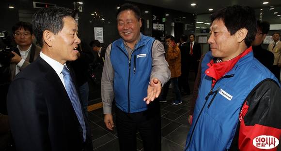 18일 서울시청에서 열린 국회 국토교통위원회의 서울시 국정감사에 앞서 주승용 위원장이 서울시 공무원 노조원들과 이야기를 나누고 있다.