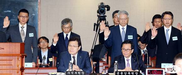 18일 서울 여의도 금융감독원에서 열린 국회 정무위원회의 금감원 국정감사에서 증인으로 출석한 현재현 동양그룹 회장을 비롯한 참석자들이 선서를 하고 있다. 사진 왼쪽부터 김철 동양네트웍스 대표, 이승국 전 동양증권 사장, 현 회장, 정진석 동양증권 사장.