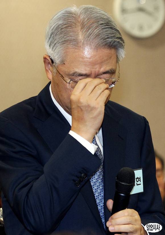 18일 서울 여의도 금융감독원에서 열린 국회 정무위원회의 금감원 국정감사에서 증인으로 출석한 현재현 동양그룹 회장이 의원들의 질의를 경청하는 도중 안경을 고쳐쓰고 있다.