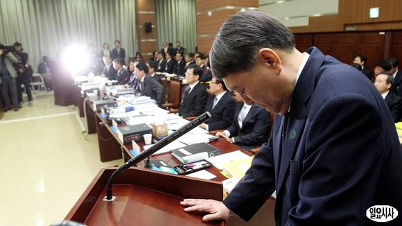 국정원 대선개입 의혹 특별수사팀장이었던 윤석열 여주지청장이 21일 서울 서초동 고등검찰청에서 열린 국회 법제사법위원회 국정감사에 참석해 의원들의 질의를 경청하는 도중 고개를 숙이고 있다.