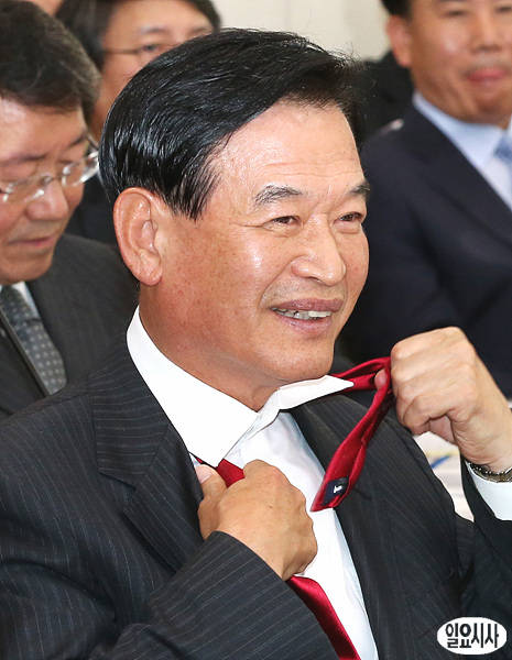 서상기 새누리당 의원 겸 국민생활체육회 회장이 21일, 국회에서 열린 교육문화체육관광위 국정감사에 출석해 붉은색 넥타이를 풀면서 웃고 있다.