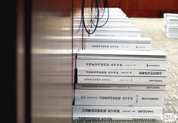 21일, 국회에서 열린 산업통상자원위원회 국정감사장에 국감자료 책자들이 빼곡히 쌓여져 있다.