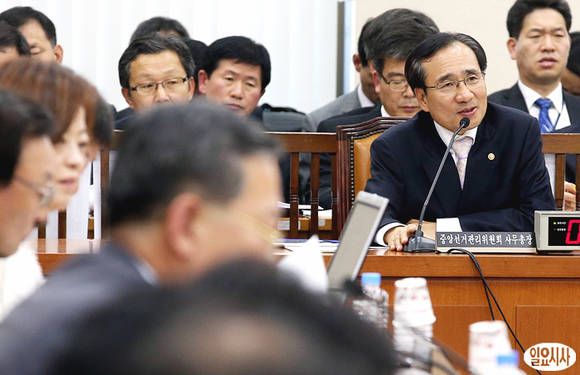 문상부 중앙선거관리위원회 사무총장이 21일  국회에서 열린 안전행정위의 중앙선관위 국정감사에서 의원들에 질의에 답변하고 있다.