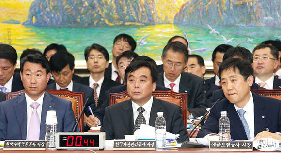 김주현 예금보험공사 사장(오른쪽부터), 장영철 한국자산관리공사 사장, 서종대 한국주택금융공사 사장이 21일 국회에서 열린 정무위의 국정감사에 증인으로 출석해 있다.