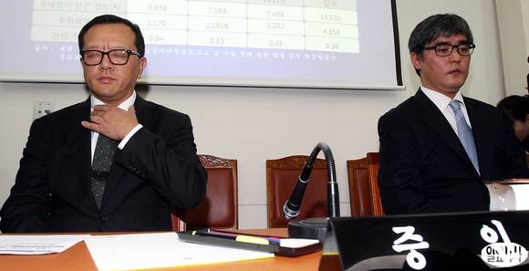 21일 서울 수송동 국세청에서 열린 국회 기획재정위원회의 국세청 국정감사에 증인으로 출석한 전두환 전 대통령의 장남인 전재국 시공사 대표(왼쪽)와 김우중 전 대우그룹 회장의 셋째 아들 김선용 코랄리스 인베스트먼트 대표가 의원들의 질의를 경청하고 있다.