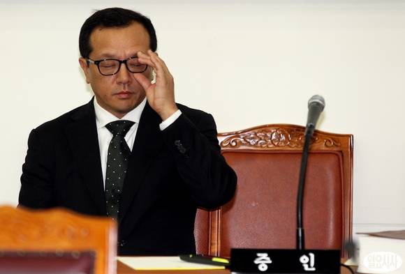 21일 서울 수송동 국세청에서 열린 국회 기획재정위원회의 국세청 국정감사에 증인으로 출석한 전두환 전 대통령의 장남인 전재국 시공사 대표가 안경을 매만지고 있다.