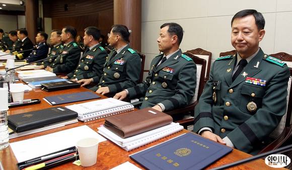 22일 서울 용산구 국방부에서 열린 국회 국방위원회의 합동참모본부에 대한 국정감사에서 최성만 국군심리전단장(맨 오른쪽)을 비롯한 간부들이 자리에 앉아 있다.