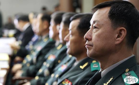 22일 서울 용산구 국방부에서 열린 국회 국방위원회의 합동참모본부에 대한 국정감사에서 최성만 국군심리전단장을 비롯한 간부들이 자리에 앉아 있다.