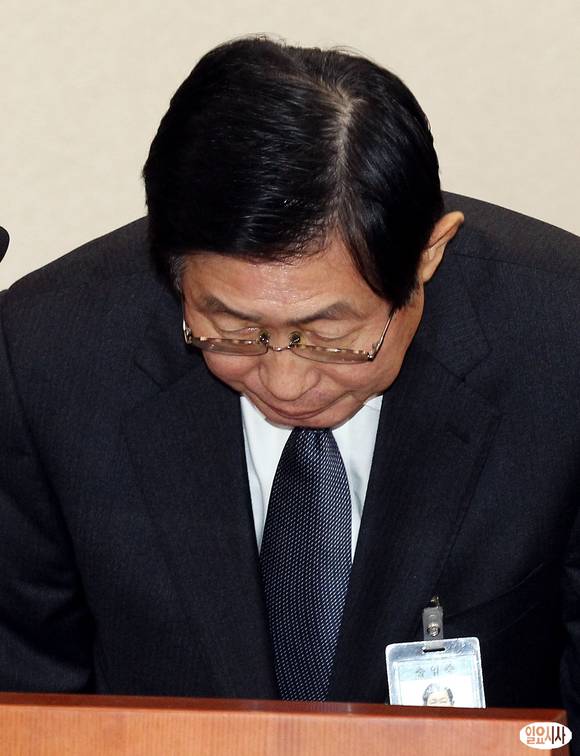 조환익 한국전력공사 사장이 25일 서울 여의도 국회에서 열린 산업통상자원위원회의 국정감사에서 업무보고를 마친 뒤 고개 숙여 인사하고 있다.