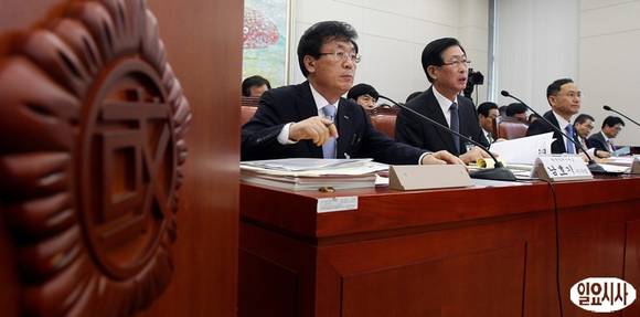조환익 한국전력공사 사장(가운데)이 25일 서울 여의도 국회에서 열린 산업통상자원위원회의 국정감사에서 의원들의 질의에 답하고 있다. 사진 왼쪽부터 남호기 한국전력거래소 이사장, 조 사장, 김병일 한전 KDN 사장.