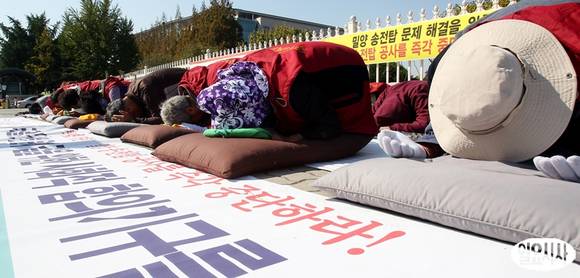 한국전력공사에 대한 국정감사가 열리는 25일 서울 여의도 국회 앞에서 밀양 765kV 송전탑 반대 대책위 회원들이 밀양송전탑 문제 해결을 위한 대국민 호소 765배를 하고 있다.
