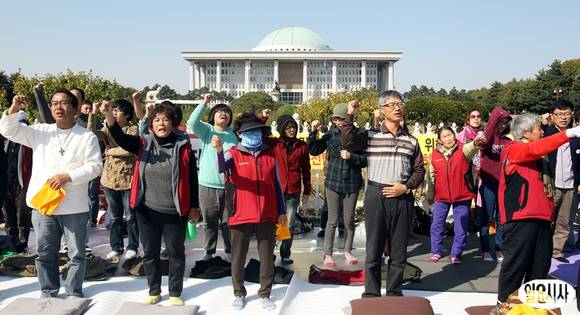 한국전력공사에 대한 국정감사가 열리는 25일 서울 여의도 국회 앞에서 밀양 765kV 송전탑 반대 대책위 회원들이 밀양송전탑 문제 해결을 촉구하며 구호를 외치고 있다.