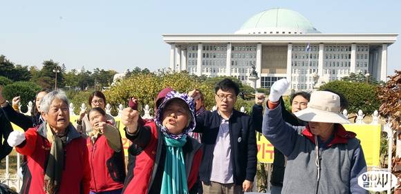 한국전력공사에 대한 국정감사가 열리는 25일 서울 여의도 국회 앞에서 밀양 765kV 송전탑 반대 대책위 회원들이 밀양송전탑 문제 해결을 촉구하며 구호를 외치고 있다.