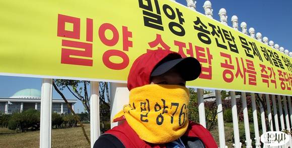 한국전력공사에 대한 국정감사가 열리는 25일 서울 여의도 국회 앞에서 밀양 765kV 송전탑 반대 대책위 회원들이 밀양송전탑 문제 해결을 촉구하며 농성을 하고 있다.