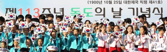 독도의 날을 맞아 25일 오후 서울 광화문 광장에서 나라독도살리기국민운동본부 주최로 열린 '독도의 날 기념식'에서 어린이들이 태극기를 흔들고 있다.