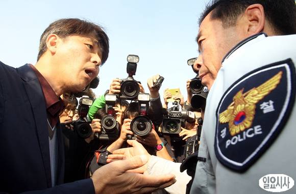 정부의 통합진보당에 대한 정당해산심판 청구가 국무회의를 통과한 5일, 서울광장에서 '통합진보당 해산기도 중단'을 촉구하는 긴급 기자회견이 열리고 있는 가운데 경찰이 기자회견 중단을 요구하자 통진당 관계자가 항의를 하고 있다.